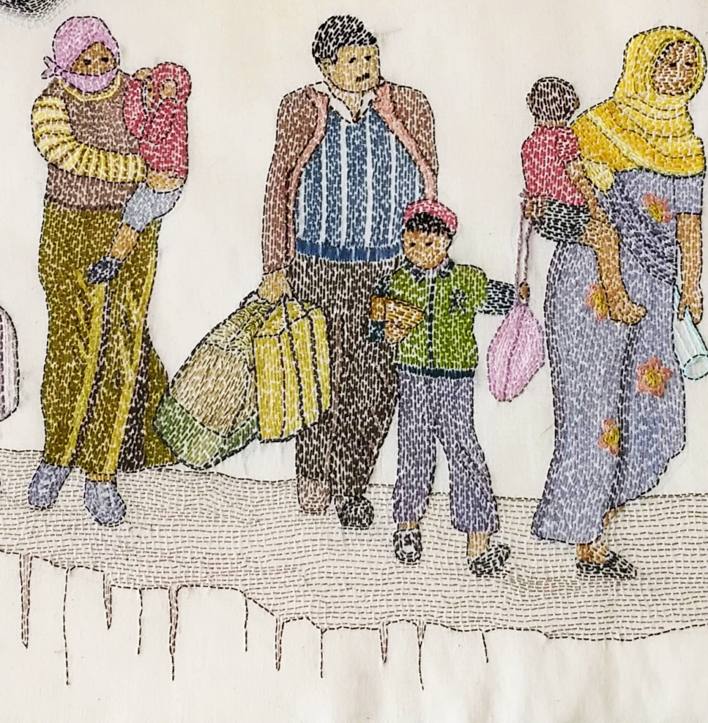 On this video podcast episode, Penny Peters describes to Gail Harker how she became involved in the community project: “25 Million Stitches”. Penny talks about the plight of the refugees and how she designed and stitched the panel from beginning to end showing their journey. Watching this video will help you to understand and develop insight into how an embroidery artist approaches a project.